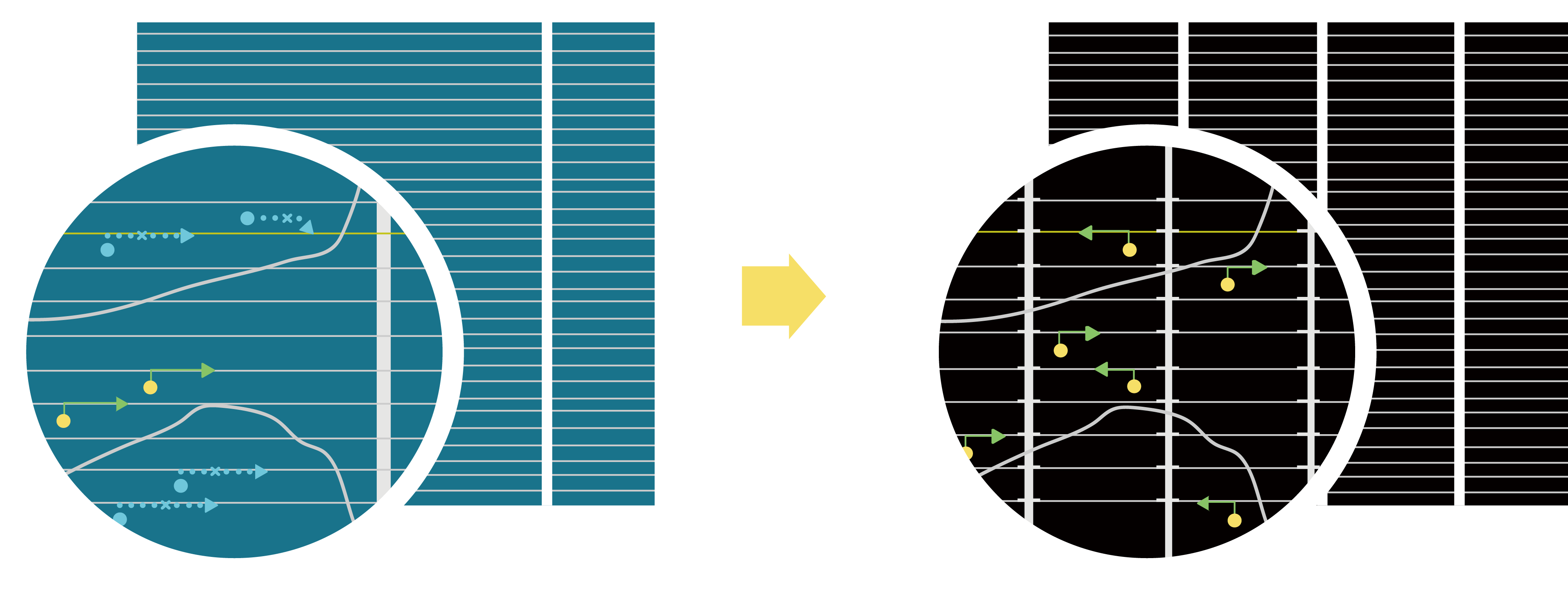 • The solar cell utilizes multiple strands of copper wire to form shorter current paths and improve current collection efficiency; the round copper wires increase the amount of light incident to the battery compared to traditional flat copper ribbons.